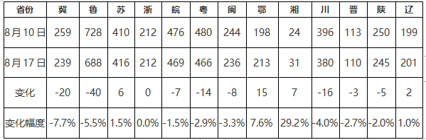 截至8月17日,重點(diǎn)監(jiān)測省份生產(chǎn)企業(yè)庫存總量為3906萬重量箱,較上周四庫存下降83萬重量箱,降幅2.08%,庫存環(huán)比降幅縮小7.71個(gè)百分點(diǎn),庫存天數(shù)約19.11天,較上周減少0.40天(注:本期庫存天數(shù)以截至本周四樣本企業(yè)在產(chǎn)日熔量核算)。本周重點(diǎn)監(jiān)測省份產(chǎn)量1311.00萬重量箱,消費(fèi)量1394.00萬重量箱,產(chǎn)銷率106.33%。